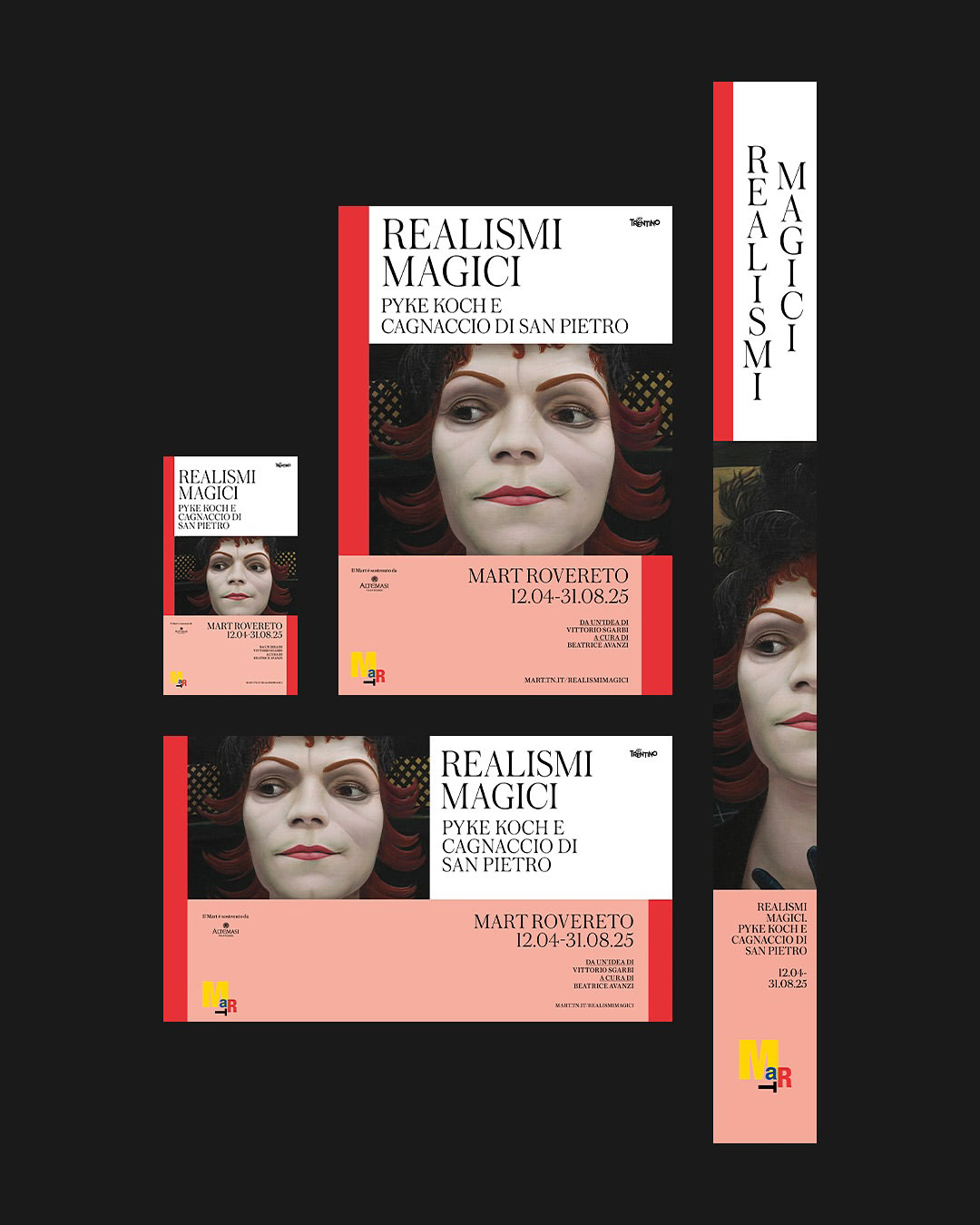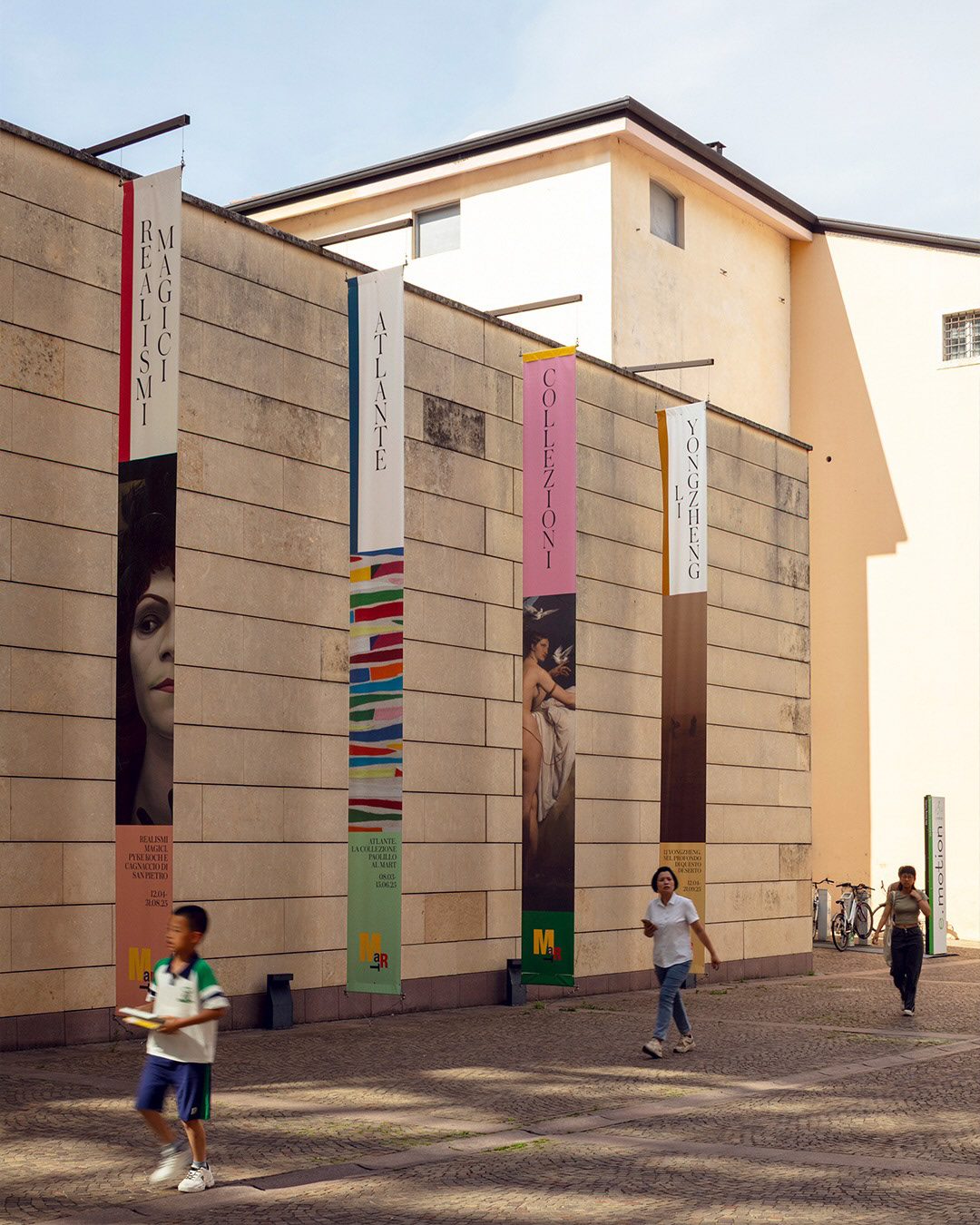Since the start of 2025 I collaborated with Studio Claudia Polizzi to update the visual system for Mart-museum of this yearYou can find it around Trento and Rovereto in a thousand different formats. The new system revolves around colourful bands that unfold to reveal the artworks featured in each exhibition.